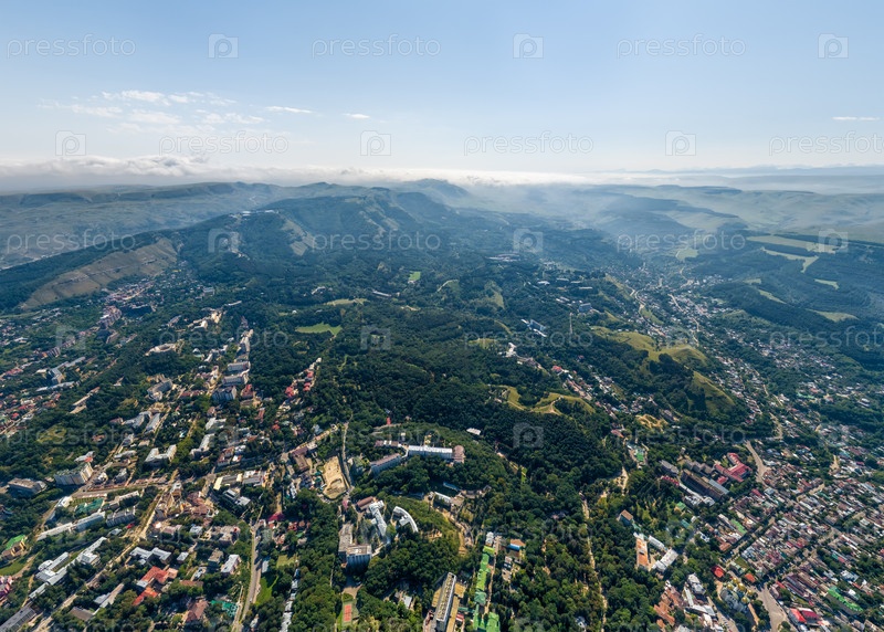 Кисловодск, Россия. Панорама города и гор. Курортный парк. С высоты птичьего полета