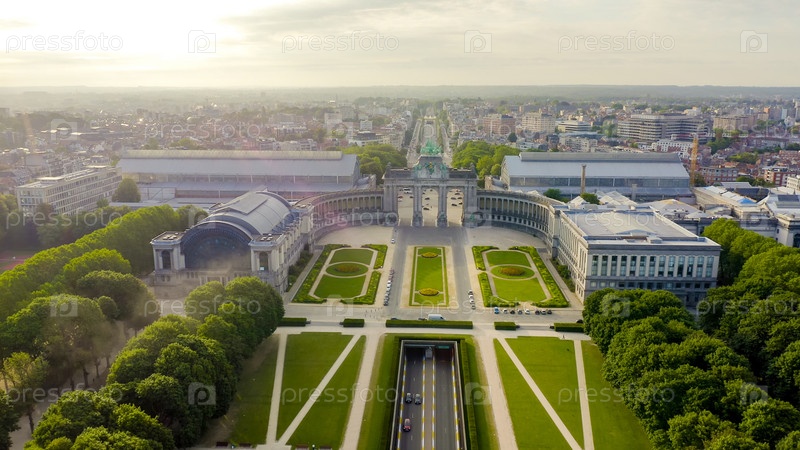Брюссель, Бельгия. Парк Пятидесятилетия. Парк Сенкантонер. Триумфальная арка Брюсселя (Брюссельские ворота), вид с воздуха