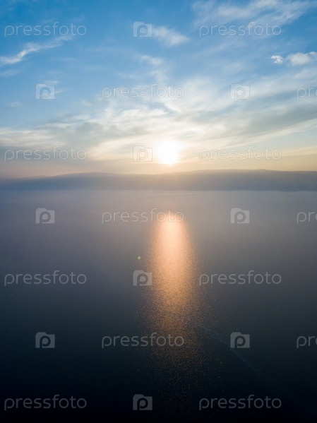 Заходящее солнце над заливом Малого моря Байкал. Россия, остров Ольхон. Снято с дрона