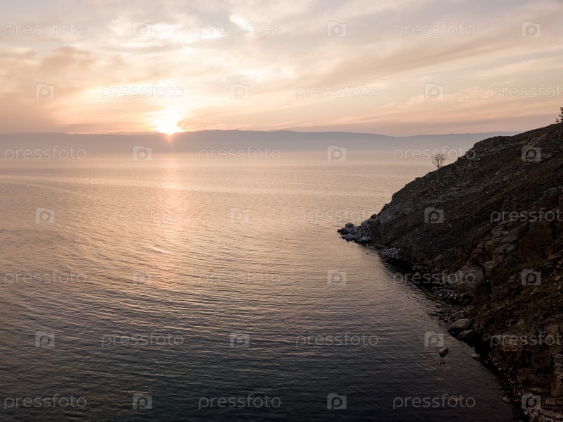 Заходящее солнце над заливом Малого моря Байкал. Россия, остров Ольхон. Снято с дрона