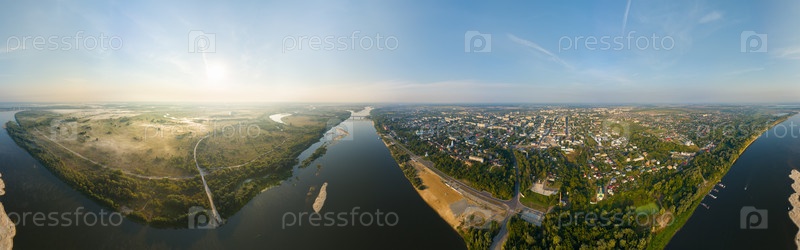 Муром, Россия. Исторический центр города и река Ока. Утренний туман. Лето. Панорама 360, вид с воздуха