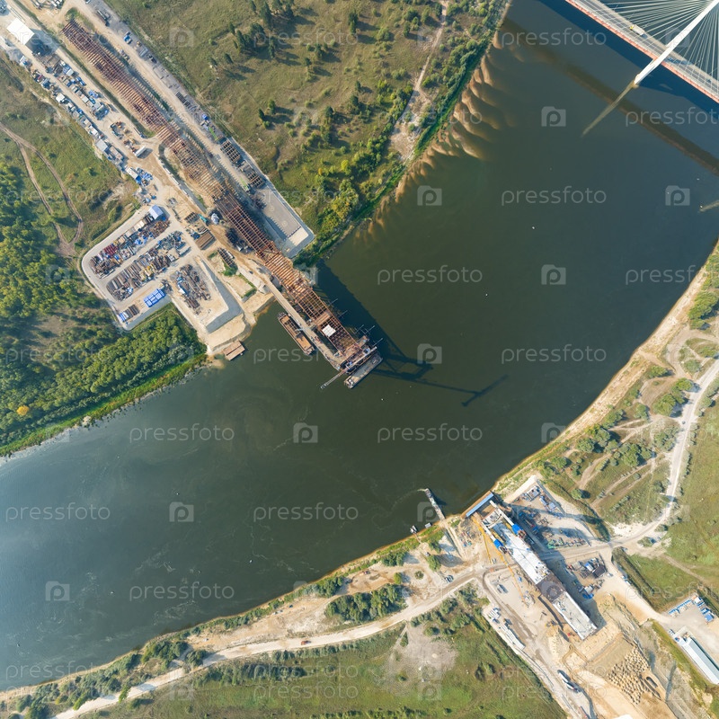 Муром, Россия. Муромский мост. Строительство моста через реку Оку. Строительная площадка трассы М12 Москва - Казань. С высоты птичьего полета