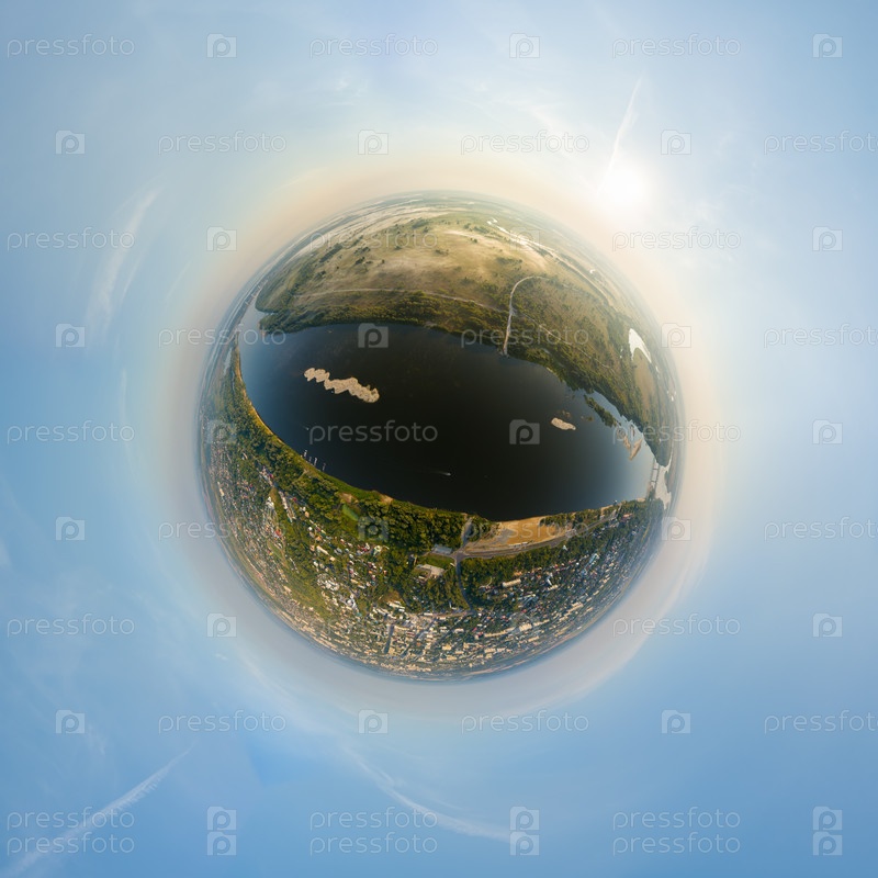 Муром, Россия. Исторический центр города и река Ока. Утренний туман. Лето. 360-градусный панорамный астероид