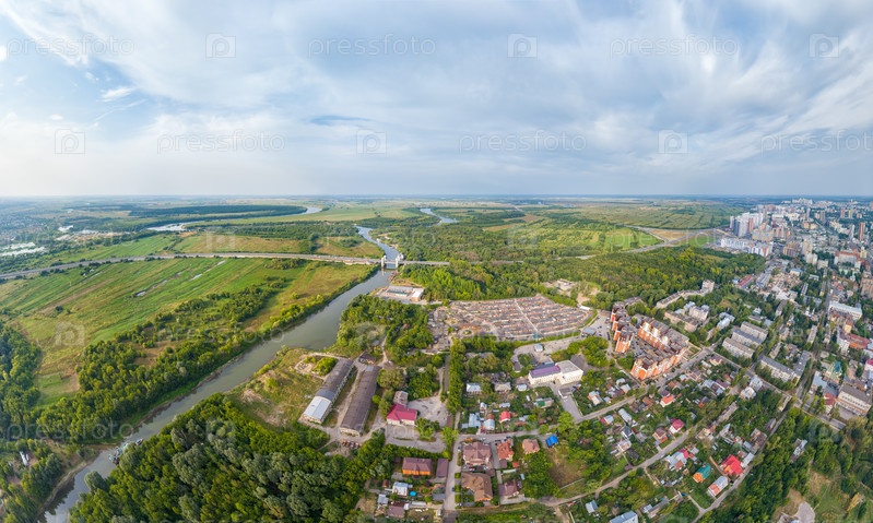 Рязань, Россия. Рязанский Кремль - Старейшая часть города Рязани. Охраняемый луг. Река Турбеж. С высоты птичьего полета