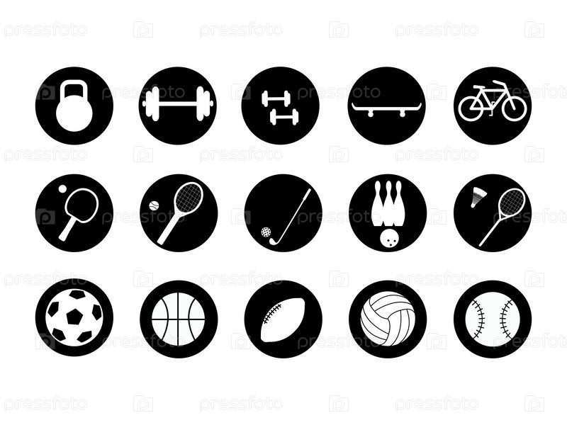 Набор спортивных круглых иконок. Коллекция из 20 векторных символов в кругах. Спортивное оборудование