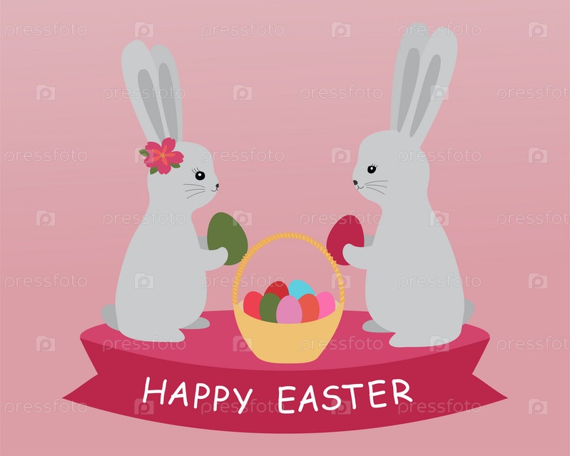 Счастливой пасхи открытка. Иллюстрация с милыми кроликами и яйцами. Векторная иллюстрация на розовом фоне