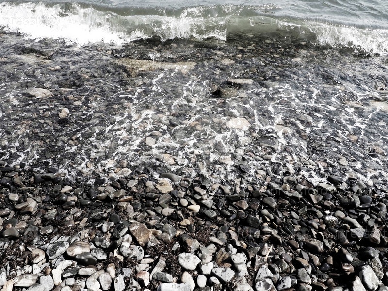 Морской каменистый пляж с волнами Сукко, Анапа, Краснодарский край, Россия. Морская пена на галечном пляже сверху. Крупные округлые гальки и валуны в воде. Горизонтальное фото Черное море, Кавказ