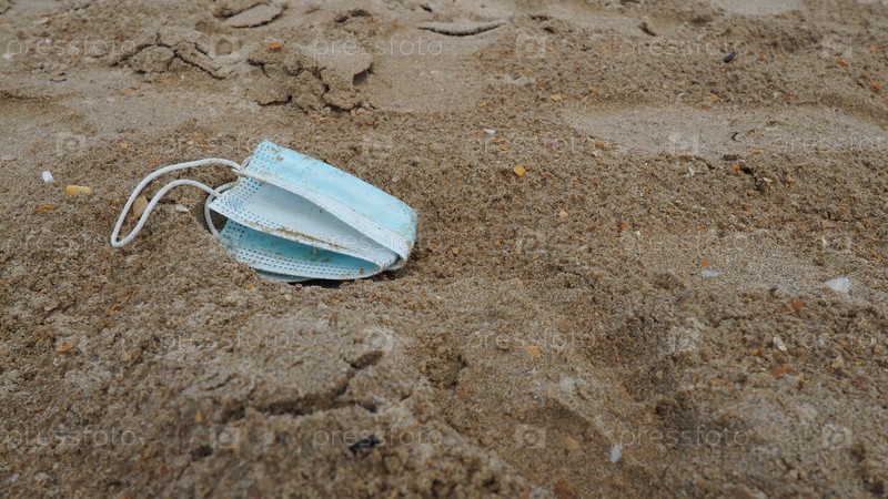 Использованную медицинскую маску оставили на песчаном пляже. Помятый синий щиток на песке. Пандемия коронавируса ковид-19. Экология, переработка и загрязнение окружающей среды одноразовыми изделиями