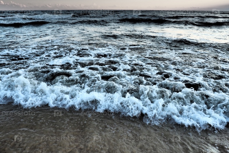 Волны с пеной. Красивый закат. Пенные волны перекатываются по песчаному берегу. Витязево, Анапа, Черное море. Туристическая Мекка, курорт. Красочные облака в вечернем небе. Лучи отражаются от воды