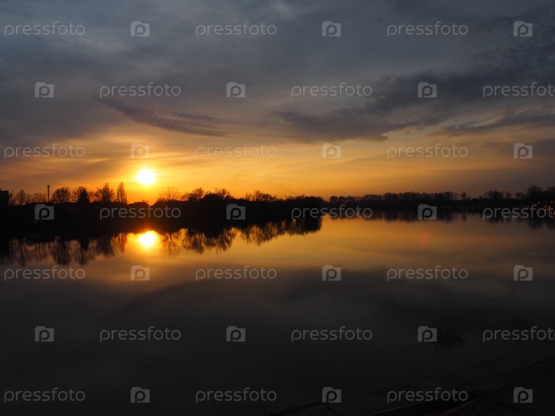 Очень красивый закат над водой. Берег реки и горизонт. Яркие облака нарисованы вечерним солнцем. Заходящее солнце. Желтое, оранжевое, серое драматическое небо и облака