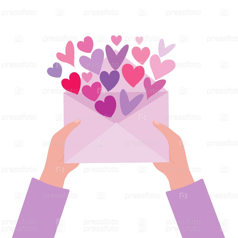 Руки держат конверт с сердечками. Сердце, символ любви и Дня святого Валентина. Векторная иллюстрация