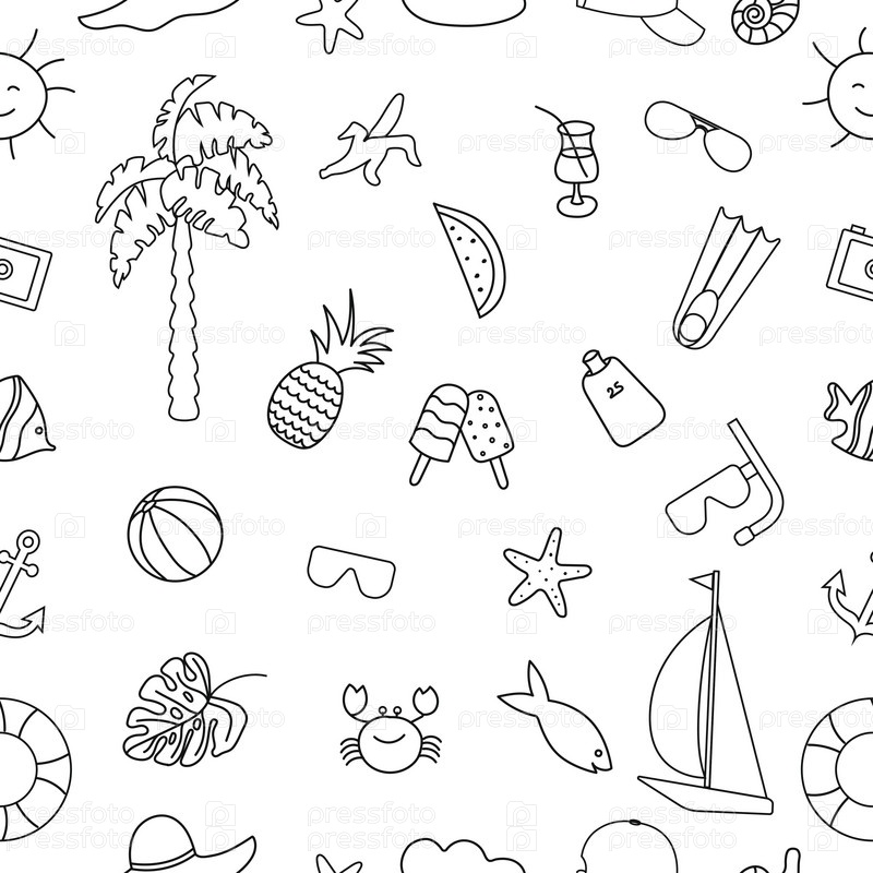 Летний бесшовный узор, нарисованный от руки каракулями. Подходит для печати, текстиля, фона, обоев, оберточной бумаги, упаковки. Белый фон