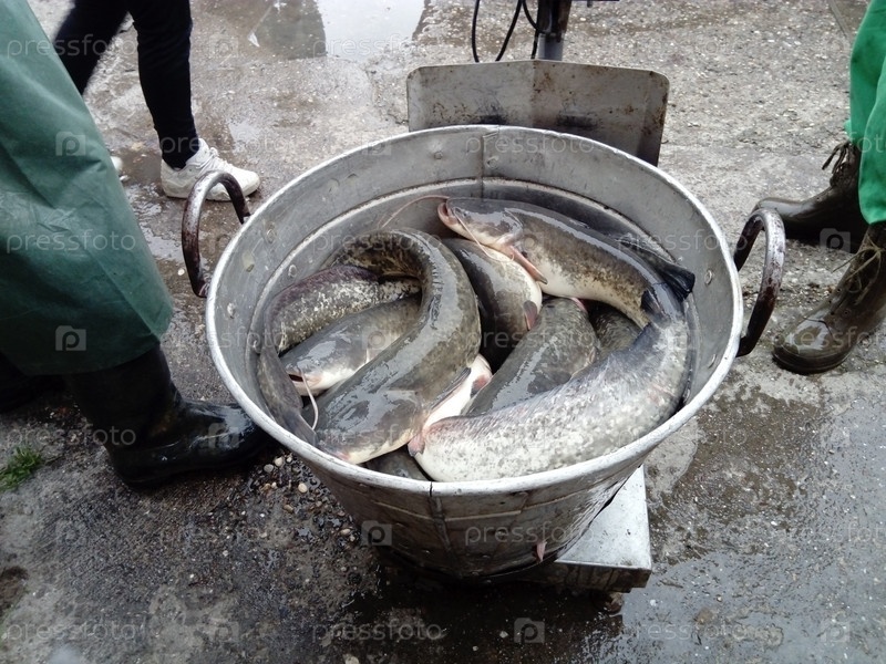 Рыба сома в оцинкованной большой миске готова к взвешиванию и загрузке в рыбохранилище. Рыба задыхается. Ноги рыбаков в черных резиновых сапогах и зеленой форме