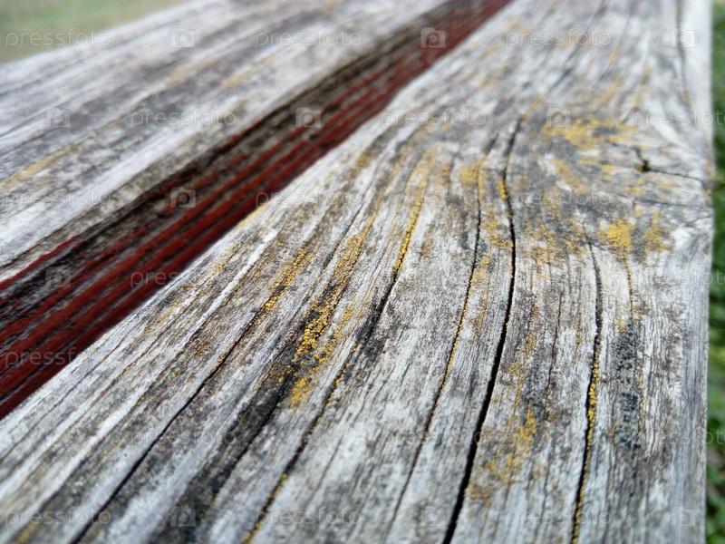 Текстура дерева. Деревянная скамейка. Мох и лишайники на поверхности. Трещины на бревне. Изделие из досок. Влага на древесине