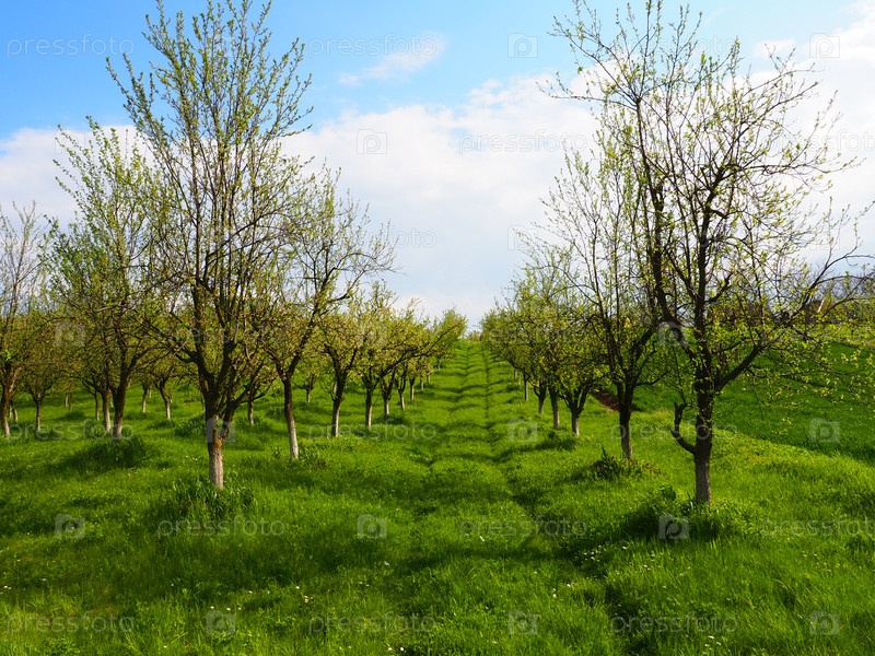 Фантастический декоративный сад с пышными цветущими деревьями в идиллический солнечный день. Живописное изображение деревьев в очаровательном саду. Цветущий яблоневый сад весной. Европа, Сербия. Волшебная страна