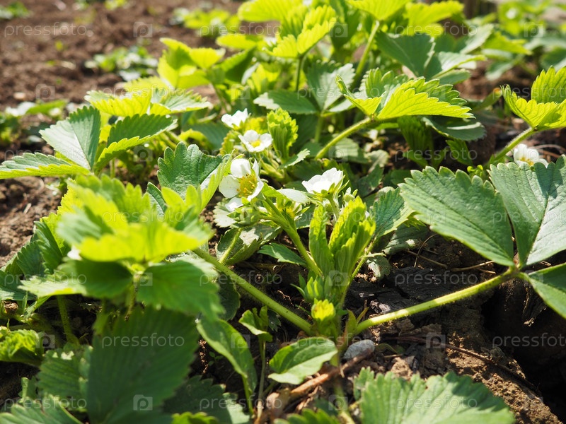 Цветущий клубничный сад. Цветущее клубничное растение. Белые цветы и зеленые листья