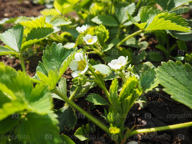 Цветущий клубничный сад. Цветущее клубничное растение. Белые цветы и зеленые листья