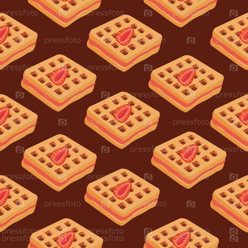 Бесшовный узор. Вафли с клубничной начинкой. Векторная иллюстрация вафель, выпечки на завтрак, сладких закусок