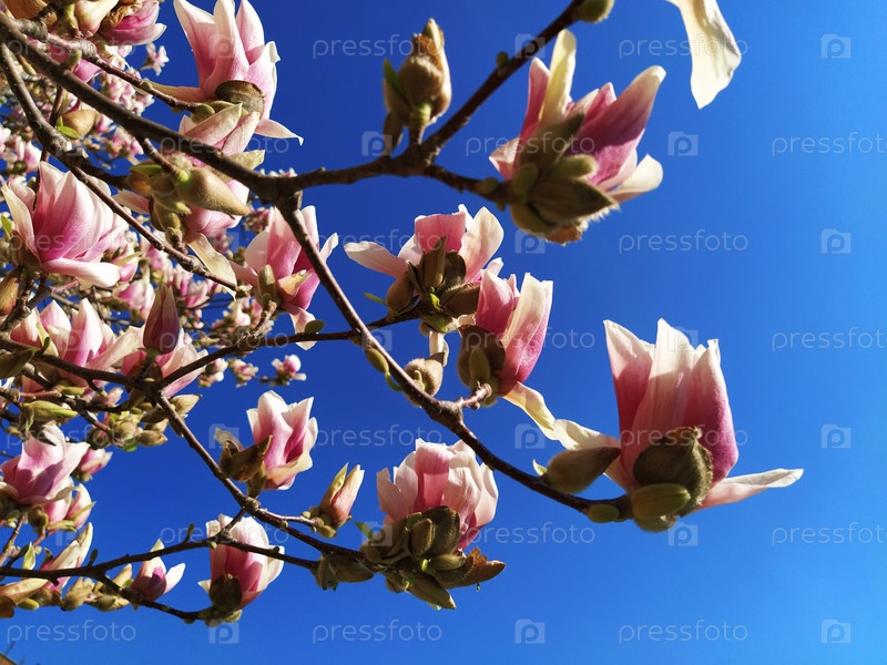 Красивые цветущие розовые цветы и бутоны магнолии на ветвях без листьев. Голубое небо и солнечный свет. Приглашение на свадьбу или открытка с 8 марта. Начало весны. Нежные белые лепестки