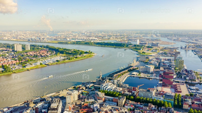 Антверпен, Бельгия. Пролетая над крышами исторического города. Река Шельда (Эско). Промышленная зона города, вид с воздуха