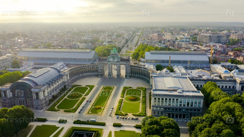 Брюссель, Бельгия. Парк Пятидесятилетия. Парк Сенкантонер. Триумфальная арка Брюсселя (Брюссельские ворота), вид с воздуха