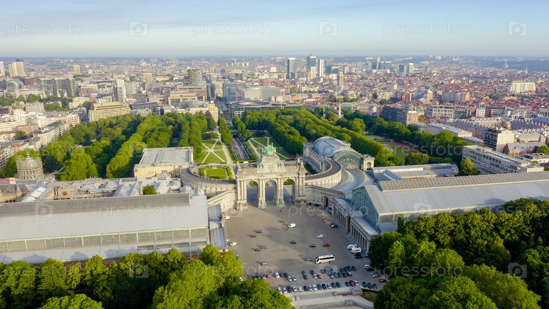 Брюссель, Бельгия. Парк Пятидесятилетия. Парк Сенкантонер. Триумфальная арка Брюсселя (Брюссельские ворота), вид с воздуха