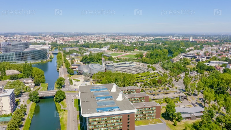 Страсбург, Франция. Комплекс зданий - Европарламент, Европейский суд по правам человека, Дворец Европы, Вид с воздуха