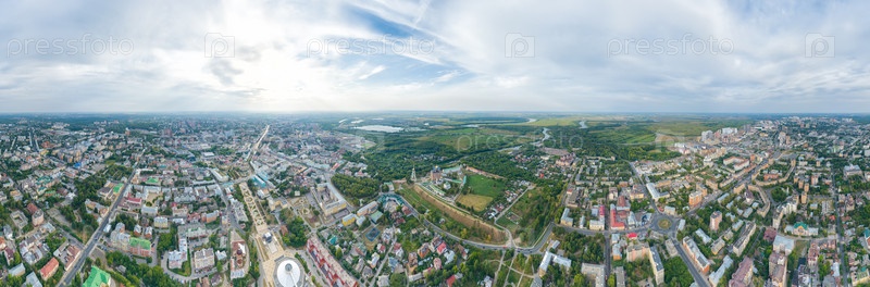 Рязань, Россия. Рязанский Кремль - Старейшая часть города Рязани. Охраняемый луг. Панорамный вид на город с воздуха. Панорама 360. Вид с воздуха