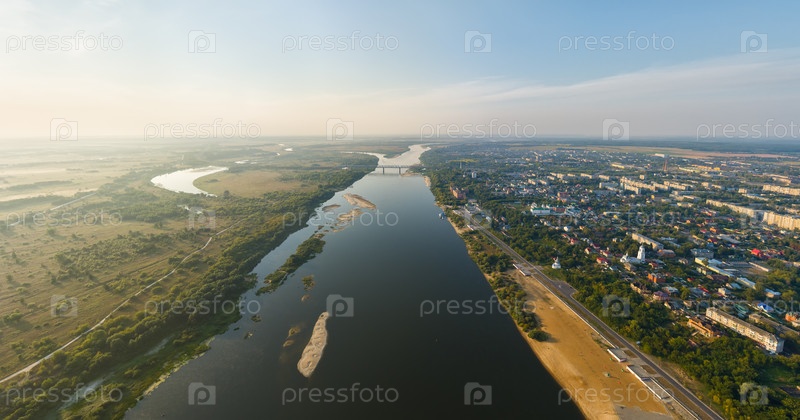 Муром, Россия. Исторический центр города и река Ока. Утренний туман. Лето. С высоты птичьего полета