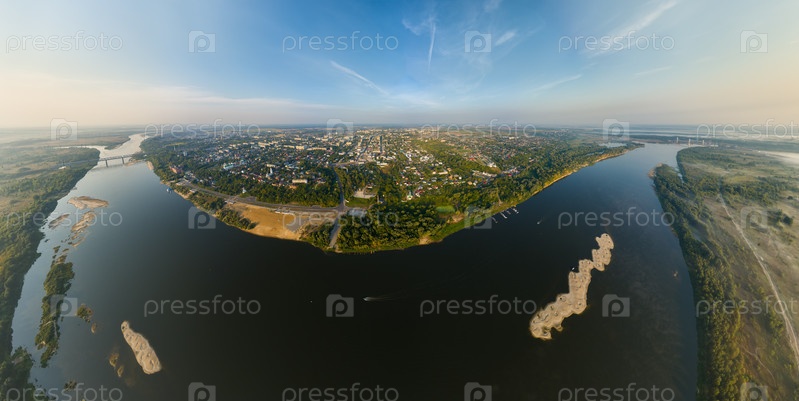 Муром, Россия. Исторический центр города и река Ока. Утренний туман. Лето. С высоты птичьего полета