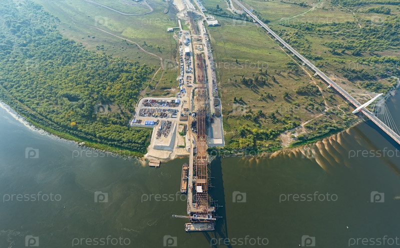 Муром, Россия. Строительство моста через реку Оку. Строительная площадка трассы М12 Москва - Казань. С высоты птичьего полета