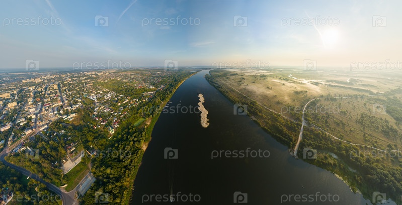 Муром, Россия. Исторический центр города и река Ока. Утренний туман. Лето. С высоты птичьего полета