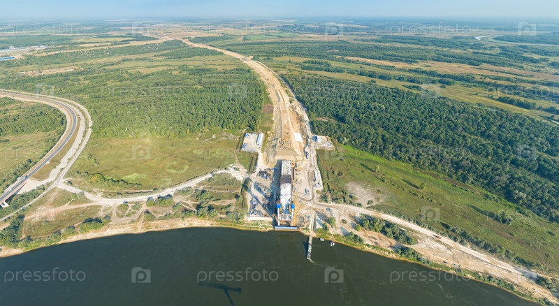 Муром, Россия. Строительство моста через реку Оку. Строительная площадка трассы М12 Москва - Казань. С высоты птичьего полета