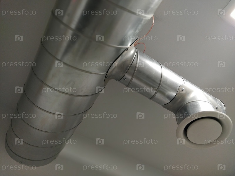 Вытяжка в общественном туалете. Круглая металлическая труба с серым экстрактором воздуха. Системы инженерной вентиляции. Оцинкованные трубы под потолком комнаты. Пластиковый круглый наконечник