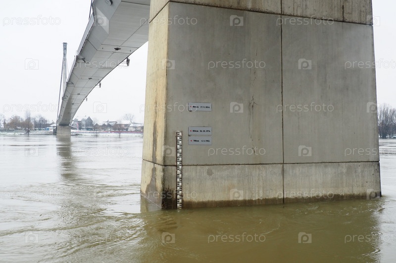 Сремска-Митровица, Сербия, 27.01.2023 Мост через реку Сава. Наводнение после сильных дождей и таяния снега. Стремительный поток мутной воды. Гидрологическая шкала для измерения уровня воды