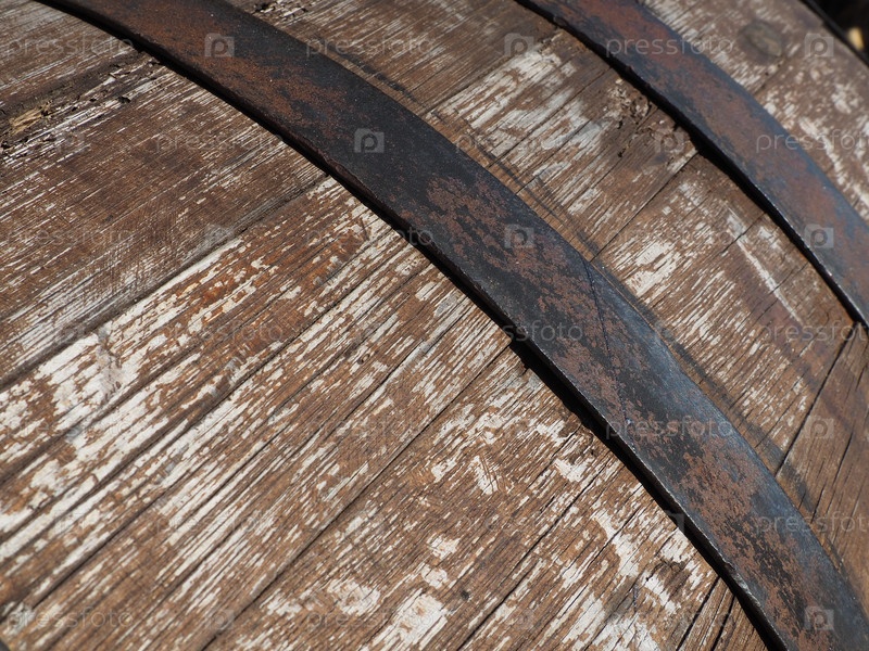 Традиционная старая деревянная бочка с изогнутыми стенками и металлическими обручами. Посуда для созревания алкогольных напитков - медовухи, пива, вина, виски. Перекатываемый цилиндрический сосуд для жидких веществ