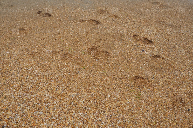 Следы на закате с золотым песком. Песчаный мокрый пляж и шаги. Лечебный крупнозернистый кварцевый песок с ракушками. Витязево, Анапа, Краснодарский край, Россия. Туристические следы