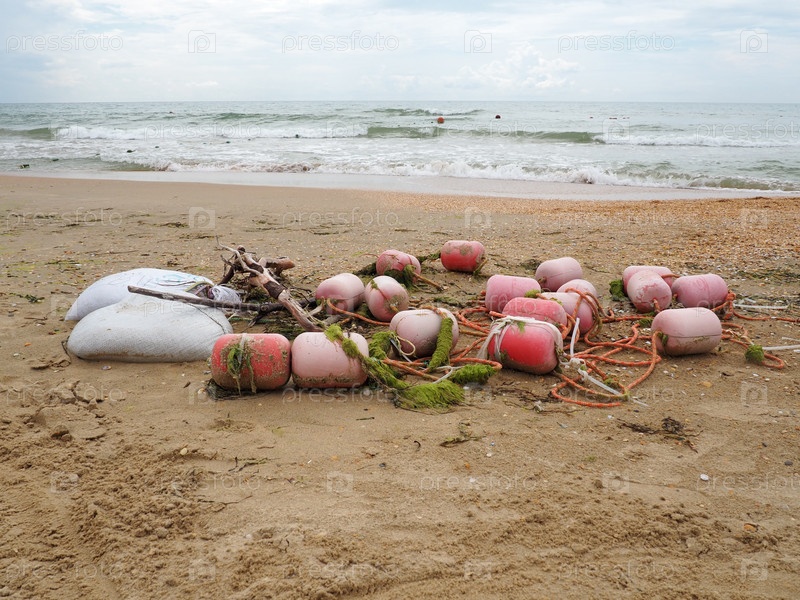 Буи в песке. Пляж с мокрым крупным кварцевым песком. На берегу остались спутанные веревки и пластиковые буйки. Спасательное оборудование. Конец летнего сезона. Штормовая погода на море или океане. Отлив