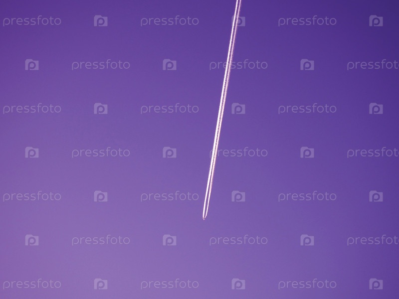 Самолет летит в небе. Вечернее пурпурное небо. Выбросы керосина или гептилового ракетного топлива. Экологическая концепция. Авиационный бизнес и пассажирские перевозки