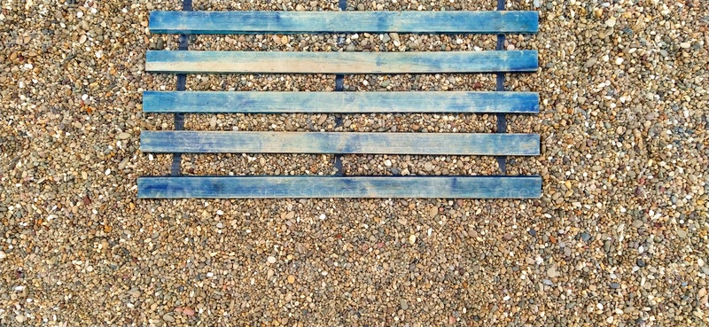 Деревянный настил на берегу. Палки и доски на каменистой почве. Защита пятки от повреждений. Летнее время и пляжный отдых. Концепция путешествий и туризма