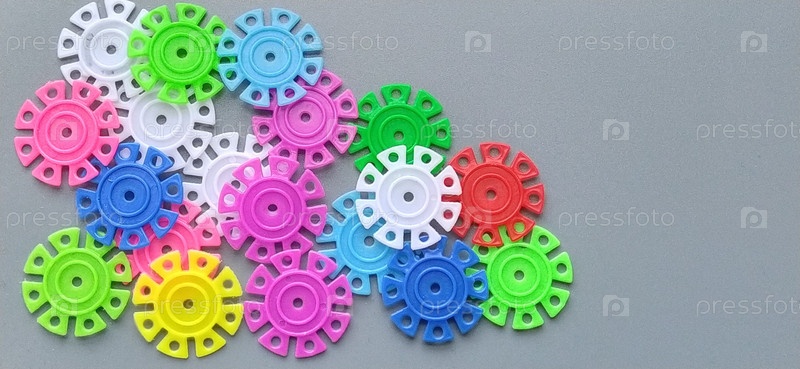 Разноцветные детали в виде снежинок от детского конструктора на сером фоне. Красные, желтые, зеленые, синие, белые, розовые пластиковые диски для развития мелкой моторики пальцев