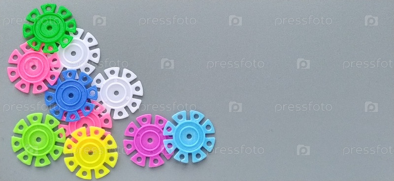 Разноцветные детали в виде снежинок от детского конструктора на сером фоне. Красные, желтые, зеленые, синие, белые, розовые пластиковые диски для развития мелкой моторики пальцев