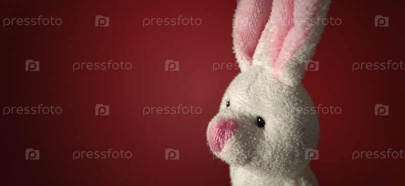 Одинокий плюшевый кролик грустит и смотрит в сторону. Темно-красный фон. Детская игрушка белого цвета. Открытка на День святого Валентина. Безответная любовь и депрессия