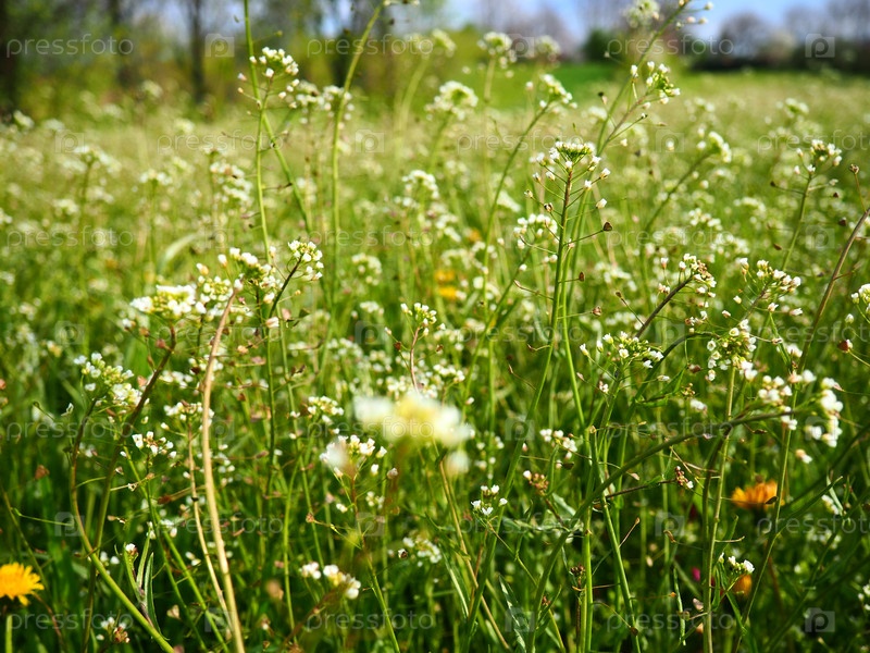 Растение пастушьей сумки на лугу. Capsella bursa-pastoris. Луга или поле. Лесная лужайка в лесу. Цветящие полевые травы. Цветущая дикая луга или пастбище. Свежая зеленая трава весной. Белые цветы