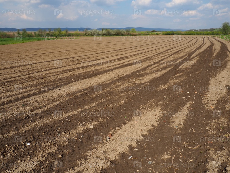 Пейзаж с распаханными сельскохозяйственными угодьями, подготовленными к уборке урожая. Сельскохозяйственный ландшафт, пахотные земли для однолетних культур, которые можно вспахать и использовать для выращивания сельскохозяйственных культур. Сербия, Сремск