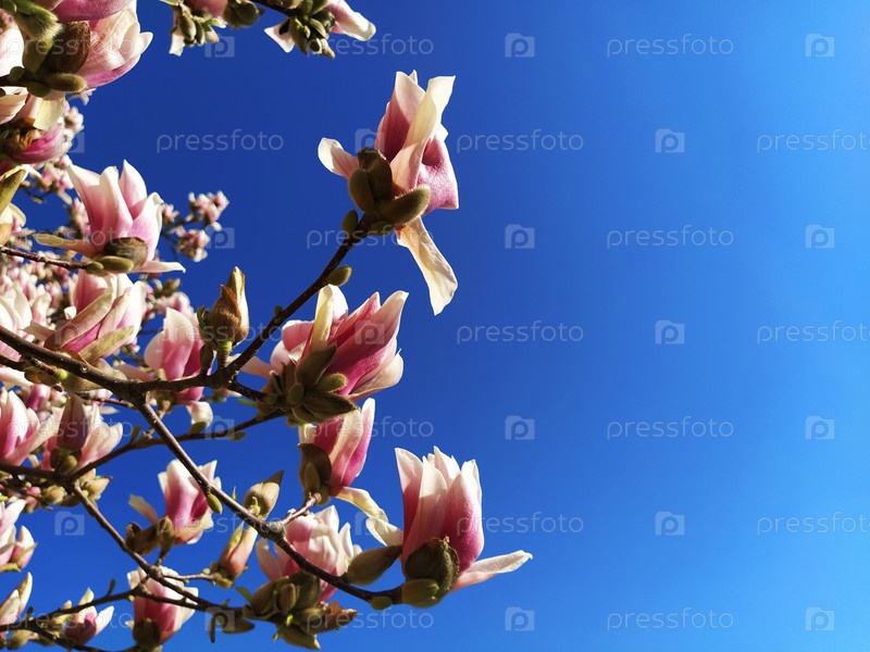 Красивые цветущие розовые цветы и бутоны магнолии на ветвях без листьев. Голубое небо и солнечный свет. Приглашение на свадьбу или открытка с 8 марта. Начало весны. Нежные белые лепестки