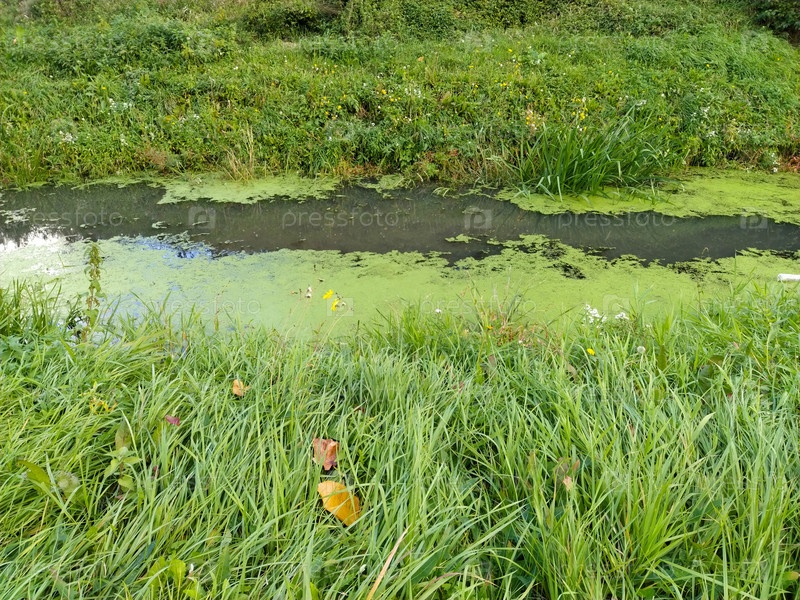 Заболоченное лесное озеро. Болото с ряской. Красивое спокойное место. Стоячая вода в водохранилище. Зеленая густая трава на берегу. Начало осени на Балканах