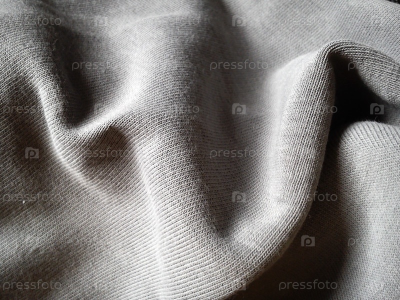Крупный план и текстура серого трикотажа, слегка сложенного волнами или морщинистого. Игра света и тени на полотне машинной вязки при естественном дневном освещении. Мягкий, плотный, теплый хлопковый материал