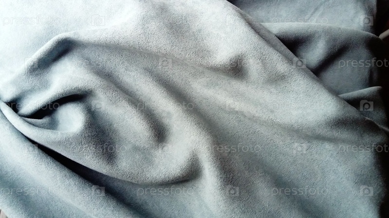 Крупный план бархатистой плотной ткани для штор серого цвета, хаотично сложенной красивыми плавными волнами. Естественный дневной свет