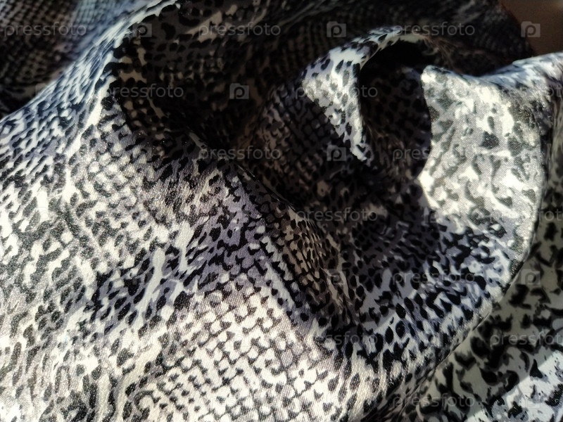 Мятая шелковая серая пятнистая ткань. Приятный блеск ткани, переливы света отражаются в куске текстиля